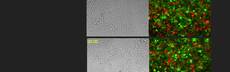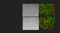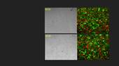 Pyroptosis blockedIf they encounter signs of infection or damage, human macrophages assemble inflammasomes and die by pyroptosis, indicated by the influx of a red DNA dye (top). Cells expressing inhibitory nanobodies no longer die by pyroptosis. This allows us to study processes immeately before cell death (bottom).